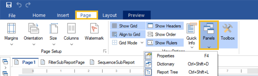 El árbol de reporte de la imagen muestra ambos componentes, como Página 1 y PageHeaderBand1.