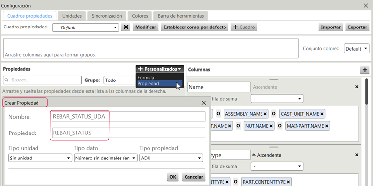 Puede crear sus propias propiedades en Organizador y usarlas en columnas de propiedades de la misma forma que cualquier otra propiedad. Si desea usar las propiedades en el modelo, puede añadirlas a los objetos de modelo en las categorías de propiedades.