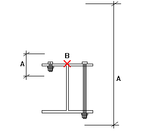 Permite indicar las partes que conecta el tornillo. El valor define el área en la que Tekla Structures debe buscar partes que pertenezcan al grupo de tornillos. Con la longitud de corte puede determinar si el tornillo pasa por un ala o dos. Tekla Structures busca partes utilizando la mitad del valor de la longitud de corte en ambas direcciones desde el plano del grupo de tornillos. En la ilustración siguiente, A es la longitud de corte y B es el origen de tornillo. Tekla Structures calcula el área de búsqueda como A/2 en ambas direcciones desde el punto B.