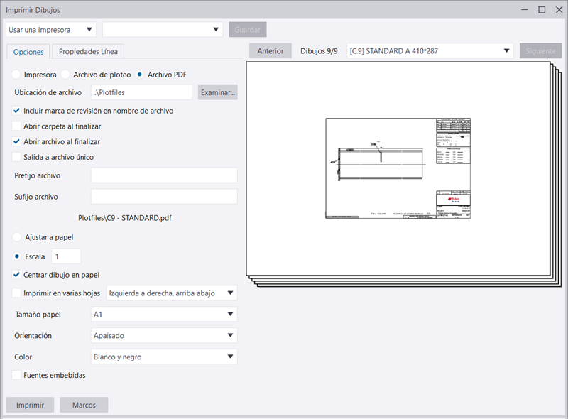 • En un dibujo abierto, solo puede obtener una vista preliminar del dibujo actual e imprimirlo. Si tiene un dibujo abierto y abre otro (por ejemplo, haciendo doble clic en otro dibujo en Gestión documentos), la vista preliminar podría no actualizarse. Seleccione el dibujo de nuevo (un solo clic) en Gestión documentos y la vista preliminar se actualizará para coincidir con la selección.