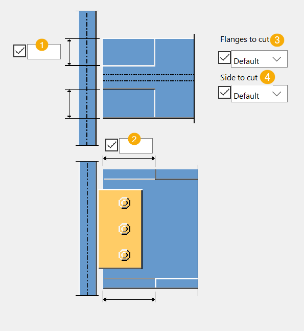 Utilice la pestaña Corte viga para controlar barras de soldadura, agujeros de acceso para soldadura, preparaciones de los extremos de las vigas y cortes de ala.