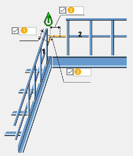 Barandilla plano a plano (90) conecta perfiles de barandilla entre sí. Se crean las partes necesarias entre las barandillas. Las barandillas tienen que estar situadas de manera que la intersección quede en el plano horizontal.