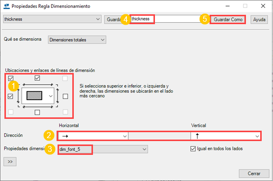 En la lista Propiedades dimensión, seleccione un conjunto adecuado de propiedades de dimensión guardadas. En este ejemplo, seleccione el archivo de propiedades de dimensión dim_font_5, que contiene una definición de una fuente más grande.