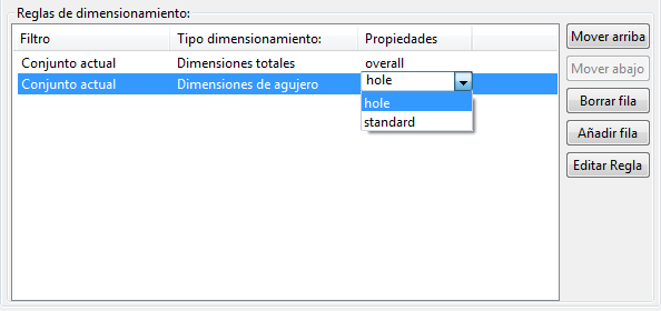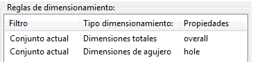 Para la regla Dimensiones totales, seleccione las propiedades overall y, para la regla Dimensiones de agujero, seleccione las propiedades hole en la columna Propiedades.