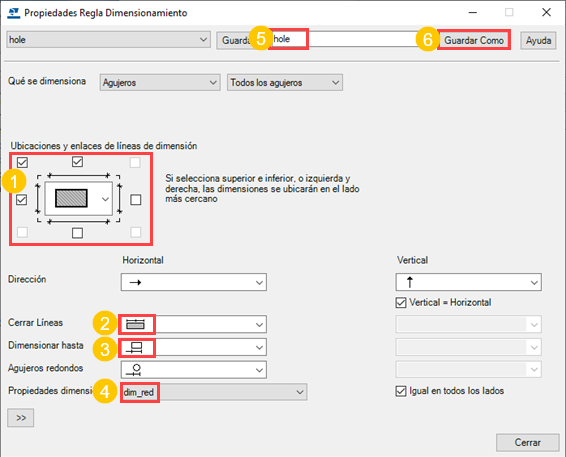 Introduzca un nombre exclusivo para la regla de dimensionamiento de agujero y haga clic en Guardar Como.