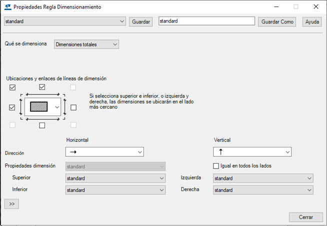 En el cuadro de diálogo Propiedades Regla Dimensionamiento, defina qué dimensionar, dónde y cómo colocar las dimensiones y qué propiedades de dimensión usar.