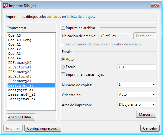 El cuadro de diálogo Imprimir Dibujos contiene opciones para configurar la impresión. Este cuadro de diálogo únicamente se muestra si ha definido XS_USE_OLD_PLOT_DIALOG como TRUE en .