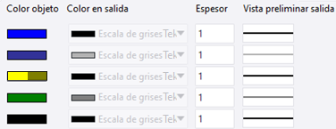 La columna Color objeto muestra el conjunto configurado de colores de objeto de dibujo por defecto. Utilice las opciones de Color en salida para definir los colores que se utilizarán en la salida y la columna Espesor para definir los anchos de línea. La columna Vista preliminar salida muestra una vista preliminar de las líneas impresas.