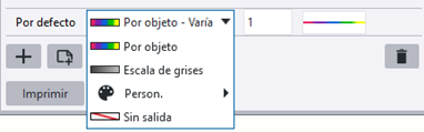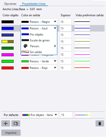 Para usar solo un color y espesor de línea en la impresión para todos los objetos, defina el color y el espesor de línea deseados para la fila Por defecto y elimine todas las filas de propiedades de línea. Si selecciona Por objeto, en la salida se usan los colores de los objetos de dibujo tal como están en el dibujo. |