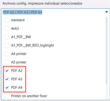 Al imprimir un conjunto de dibujos en el modo de varias impresoras con los archivos de configuración de impresora anteriores, todos los dibujos A4 generarán archivos .pdf con el prefijo A4_, todos los dibujos A3 tendrán el prefijo A3_ y todos los dibujos A2 generarán archivos .pdf con el prefijo A2_.
