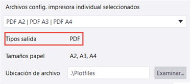Introduzca la ubicación para el archivo PDF o de ploteo, o bien utilice Examinar... para buscar la carpeta. La carpeta \Plotfiles en la carpeta del modelo es el valor por defecto. Esta opción solo está disponible si ha seleccionado Archivo PDF o Archivo de ploteo. |
