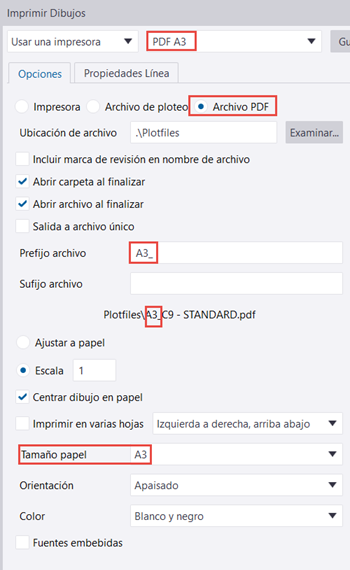 - PDF A3: Tamaño de papel definido como A3, prefijo de archivo definido como A3_