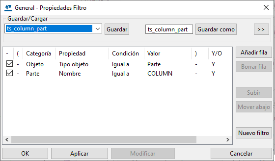 Para abrir el cuadro de diálogo General - Propiedades Filtro, haga clic en Filtro, cree un filtro por Parte - Nombre y Objeto - Tipo objeto para las columnas y haga clic en Modificar.