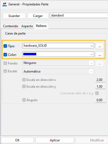 Para ir al cuadro de diálogo General - Propiedades Parte, haga clic en Parte y, en la pestaña Relleno, seleccione un relleno, defina el color de relleno como azul y haga clic en Modificar.