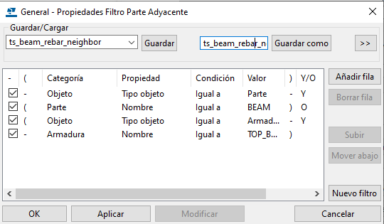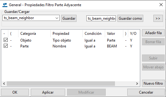 Para abrir el cuadro de diálogo General - Propiedades Filtro Parte Adyacente, haga clic en Filtro parte ady., cree un filtro por Parte - Nombre y Objeto - Tipo objeto para las vigas y haga clic en Modificar.