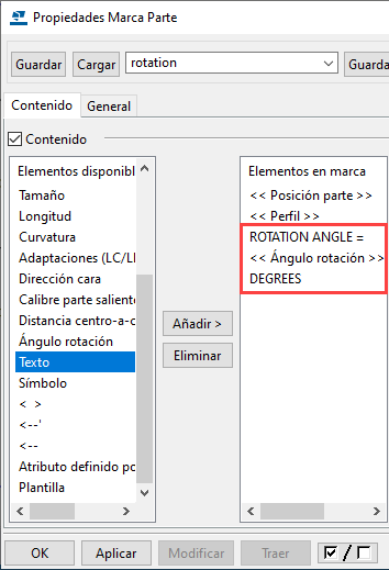 El ejemplo siguiente muestra una dimensión recta y una marca de parte que contiene la información del ángulo de rotación: