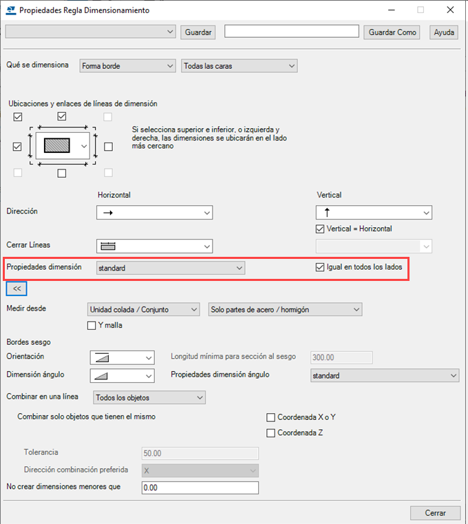 Para seleccionar diferentes propiedades de línea de dimensión para cada lado, anule la selección de Igual en todos los lados y seleccione las propiedades de dimensión de las listas.