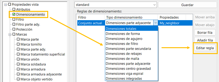 En el panel Dimensionamiento, puede añadir reglas haciendo clic en Añadir fila. A continuación, seleccione qué reglas de dimensionamiento desea usar en la columna Tipo dimensionamiento y el archivo de propiedades de regla de dimensionamiento deseado.