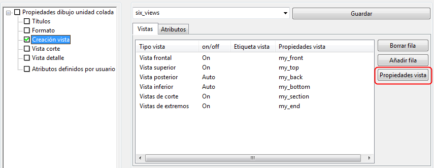 - Al hacer clic en la opción Creación vista en el árbol de opciones de las propiedades de dibujo, puede seleccionar las vistas que se crearán y las propiedades de vista que se utilizarán.