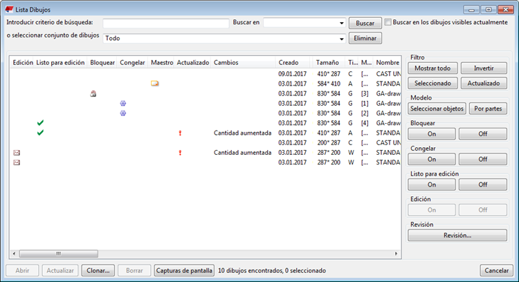 La Lista Dibujos permite seleccionar uno o varios dibujos al mismo tiempo. Seleccionar varios dibujos puede ser útil, por ejemplo, si desea bloquear o congelar varios dibujos a la vez o imprimir varios dibujos.