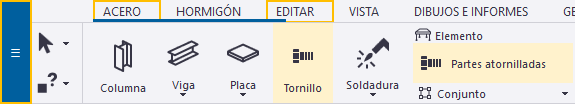 Tekla Structures resalta los comandos en la cinta o en el menú Archivo. Por ejemplo,