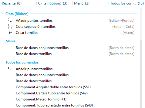 Los resultados de búsqueda muestran la ubicación del comando. Puede navegar por la lista haciendo clic en las pestañas Reciente, Cinta (Ribbon), Menú y Todos los comandos. La pestaña Reciente enumera los 10 comandos más recientes iniciados desde los resultados de búsqueda.