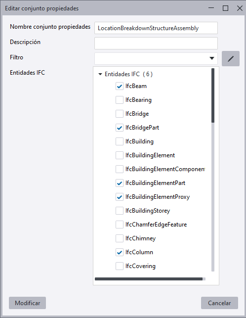 (8) Los filtros le permiten limitar aún más para qué objetos exportar el conjunto de propiedades. Por ejemplo, especifique un filtro para limitar aún más para qué objetos IfcBeam exportar el conjunto de propiedades, como solo para vigas de acero.