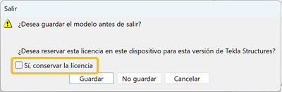 Si utiliza con frecuencia Tekla Structures en diferentes equipos, se recomienda definir el valor de la opción avanzada XS_DEFAULT_KEEP_ONLINE_LICENSE_CHECKBOX en FALSE. De esta manera, su licencia de suscripción no se mantiene reservada automáticamente cuando se cierra Tekla Structures.