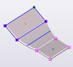 Al crear una placa plegada, Tekla Structures añade una sección curvada entre las partes seleccionadas. Puede modificar la sección curvada eligiendo una de las opciones predefinidas o modificando la forma manualmente. También puede modificar las secciones planas, que son las partes originales a partir de las que se creó la placa plegada.