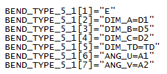 El siguiente ejemplo del archivo rebar_schedule_config.inp asigna el tipo de plegado interno 5_1 al identificador de tipo de plegado E y las dimensiones de lado y los ángulos de plegado a atributos de cuadro específicos.