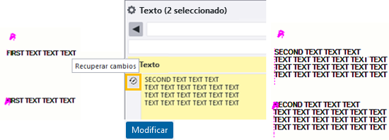 . Cuando selecciona el objeto de texto y coloca el cursor sobre el botón Recuperar cambios situado junto al cuadro Texto en el panel de propiedades, puede ver el texto modificado. Para recuperar, haga clic en el botón Recuperar cambios