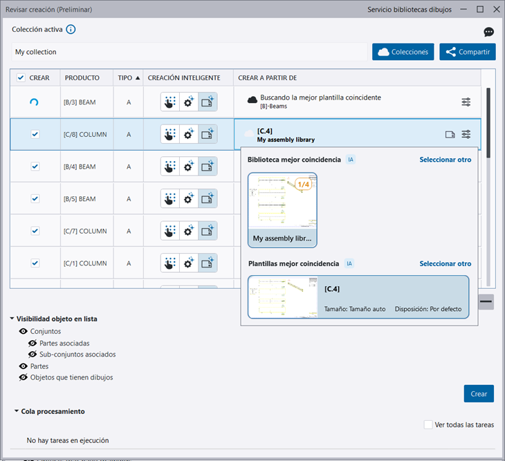 Si no se puede encontrar la mejor biblioteca, plantilla o archivo de configuración coincidente, se muestra una notificación en la fila del objeto y puede seleccionar otra opción de creación de dibujo manualmente.