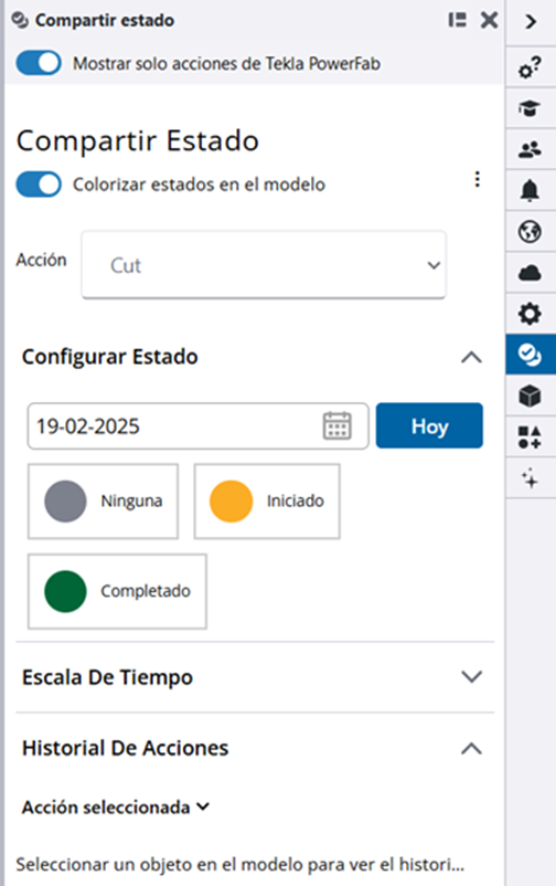 Compartir estado tiene el conmutador Mostrar solo acciones de Tekla PowerFab para ver rápidamente el estado del fabricante.