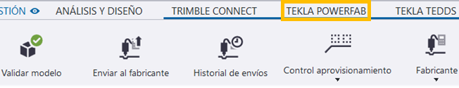 En la cinta, hay una nueva pestaña Tekla PowerFab que contiene herramientas para el flujo de trabajo colaborativo de extremo a extremo. Las herramientas ayudan al equipo del proyecto a colaborar utilizando la misma información.