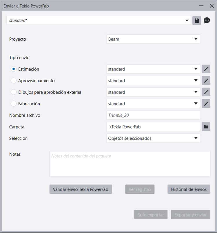 La herramienta de envío le guía cuando exporta y envía diferentes tipos de paquetes al fabricante en cualquier etapa del proyecto. Puede exportar los siguientes datos desde Tekla Structures de manera local para comprobarlos, o directamente a Tekla PowerFab para realizar la estimación, el pedido de materiales y la fabricación: