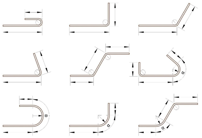 A basic distinction is made between bends (with standard diameter of mandrel 4*ds) and arches (with specification of angle and radius). Bends are marked with the bending pin symbol in the image. For further explanation of segment lengths see the current version of EN ISO 3766.