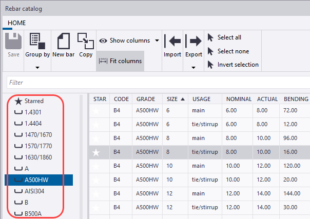 In the rebar catalog, the rebar definitions are arranged in groups. You can add, copy, modify, and delete groups, and arrange the groups according to different properties.
