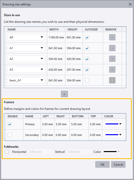 when defining drawing frame and fold mark colors in Drawing layout editor
