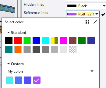 In color palette selection mode, you can select a standard or custom color to use, and in color palette editing mode, you can define and save a set of custom colors in a property file for easy reuse and sharing in a specific project, for example. Color property files can be placed in and used from all the standard file locations such as project or firm folders. The saved custom color palettes will be available in all places where you might want to change the colors: for all drawing objects on all drawing property levels, for line properties in printing, and for template objects in Template Editor.