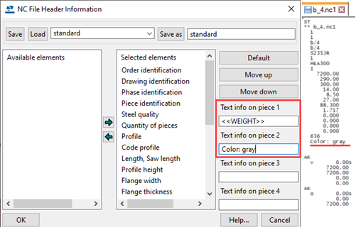 The Elements list defines which elements are included in hard stamps and the order in which the elements appear in the hard stamp. You can also define the Text height and Case. Project number: Adds the project number to the hard stamp. Lot number: Adds the lot number to the hard stamp. Phase: Adds the phase number to the hard stamp. Part position: Prefix and position number of the part. Assembly position: Prefix and position number of the assembly. Material: The material of the part. Finish: The type of finish. User-defined attribute: Adds a user-defined attribute (user fields 1-4) to the mark. Text: Opens a dialog where you can add user-defined text to the hard stamp. Including part position and/or assembly position in the hard stamp affects the NC filename: