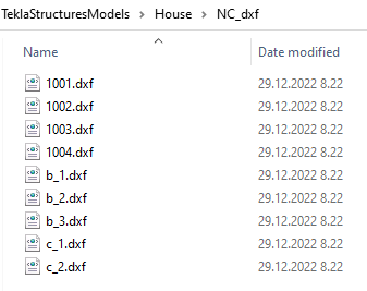 Tekla Structures produces NC files in the DSTV format (Deutscher Stahlbau-Verband) in the current model folder. In most cases, each part has its own NC file. You can also produce NC files in the DXF format by converting DSTV files to DXF files.