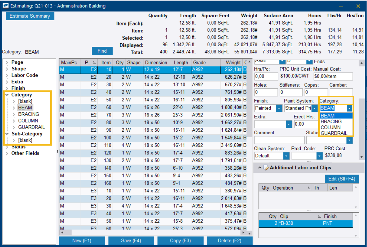Outre la possibilité de créer manuellement des catégories, vous pouvez choisir d’utiliser les catégories existantes utilisées dans Steel Erection Bid Wizard. Pour filtrer davantage les éléments, vous pouvez également ajouter des sous-catégories.