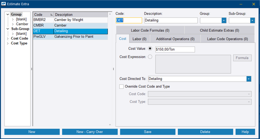 Les suppléments de chiffrage sont souvent utilisés pour tout travail en dehors de votre atelier. Par exemple, vous pouvez créer un chiffrage d’extras pour les éléments tels que le cintrage, le roulement et le façonnage.
