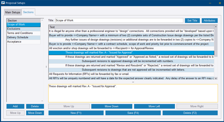 Vous pouvez modifier l’ordre des sections et modifier les titres et les styles de la proposition. Les sections et entrées que vous avez configurées sont utilisées pour créer une proposition d’enchère individuelle basée sur chaque chiffrage.