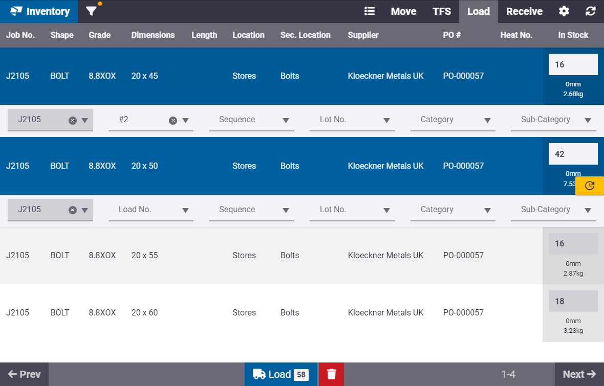 - Sélectionnez une ou plusieurs lignes d'inventaire au chargement.