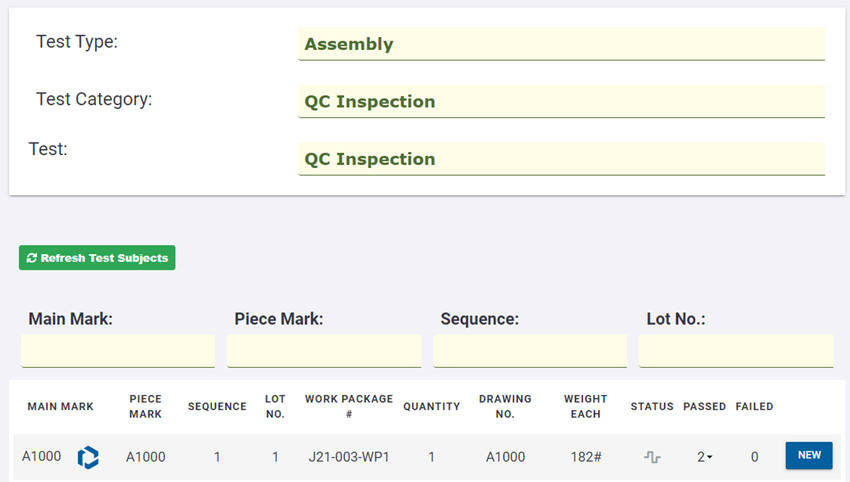 Vous pouvez ajouter des informations de test pour une affaire dans Tekla PowerFab Go. Vous pouvez ajouter des enregistrements de test au test initial et joindre des fichiers aux enregistrements de test.