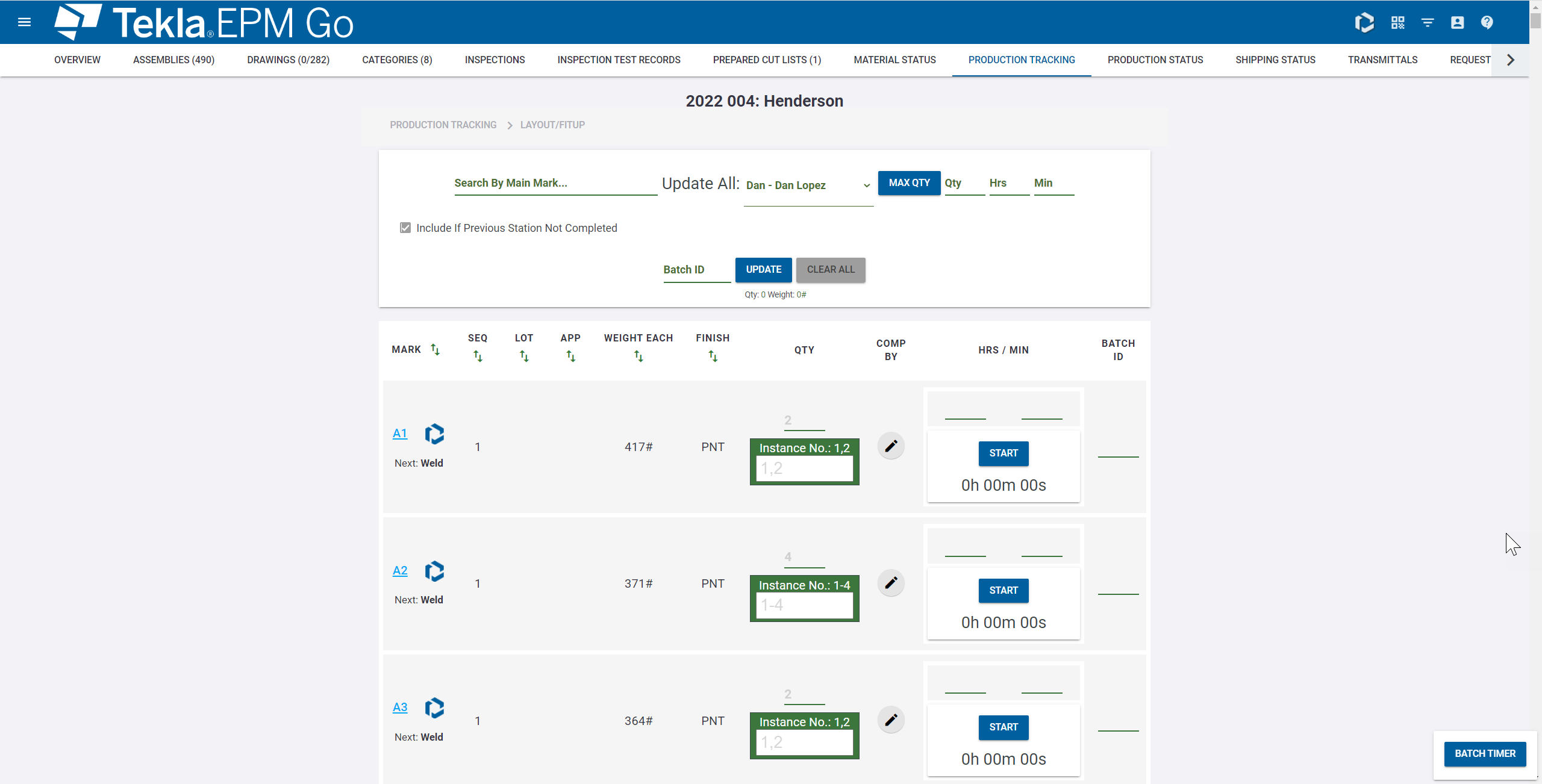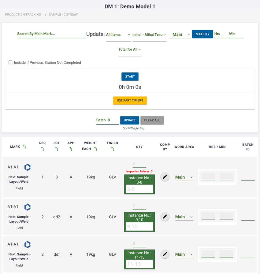 Dans Tekla PowerFab Go, vous pouvez afficher les états de production des éléments dans les tâches de contrôle de production. Vous pouvez également ajouter de nouveaux enregistrements de suivi de production pour les éléments individuels dans l'affaire en contrôle de production sélectionnée, ou supprimer les éléments ajoutés de manière incorrecte à partir des enregistrements existants. Vous pouvez également utiliser un minuteur pour le suivi de pièces.