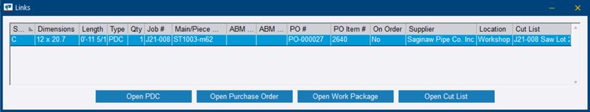 La boîte de dialogue Liens s’ouvre et affiche une liste de tous les éléments de matériau liés dans les autres Tekla PowerFab modules.