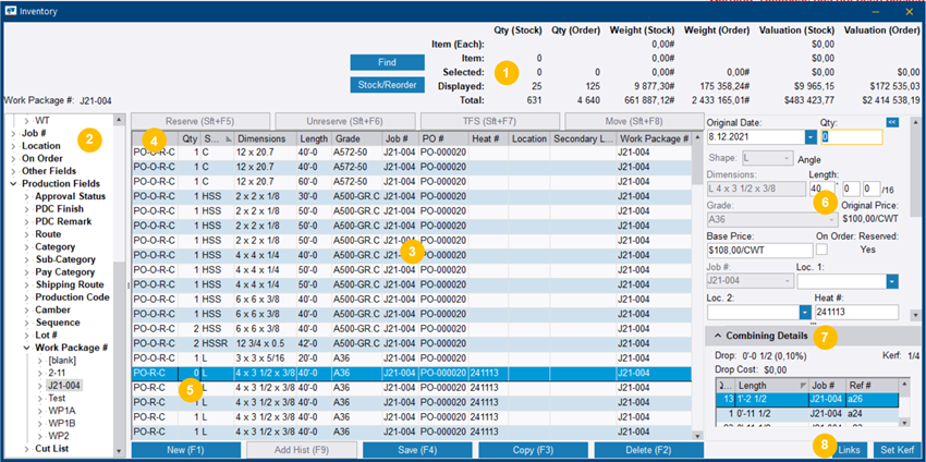 (5) Zéro élément en quantité : Espaces réservés pour les éléments qui ont été reçus sur un bon de commande, mais qui n’ont pas encore été finalisés. Les éléments de quantité nulle ne peuvent pas être modifiés dans l’inventaire et le tableau des détails de l’imbrication en dessous de la zone de saisie n’affiche aucune information sur le lien entre les éléments et les affaires en contrôle de production.