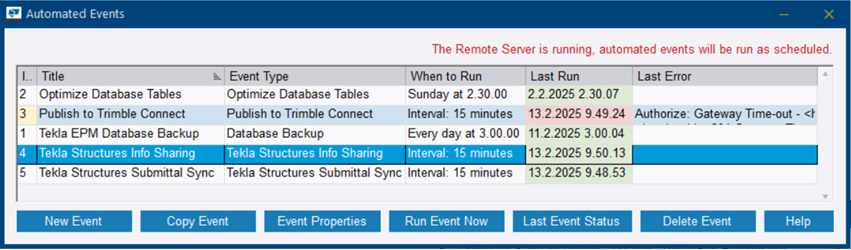 Dans la boîte de dialogue Événements automatisés, vous pouvez voir l’état de chaque événement automatisé.
